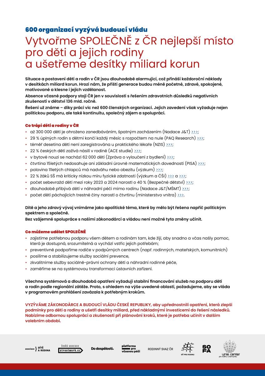 21. 10. 2025 – 600 organizací vyzývá budoucí vládu: Vytvořme SPOLEČNĚ z ČR nejlepší místo pro děti a jejich rodiny a ušetřeme desítky miliard korun,